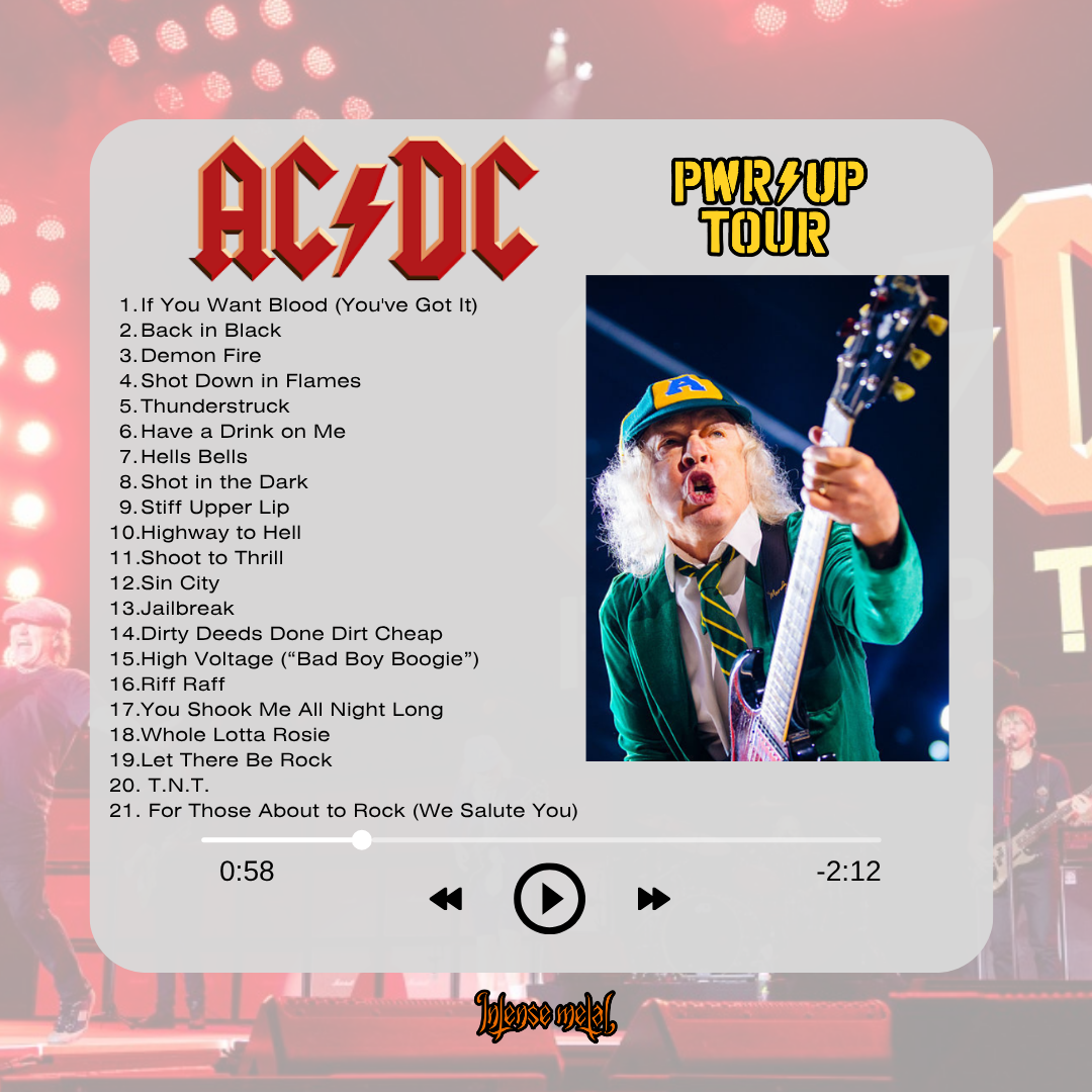 Cuando las pantallas mostraron un coche V8 clásico y tronaron los primeros acordes de “If You Want Blood (You’ve Got It)”, la tacha decidió que era momento de explotar. No sé si fue la química, la euforia o el magnetismo de Angus, pero el descontrol fue absoluto. Cada riff me recorría la columna como una descarga.