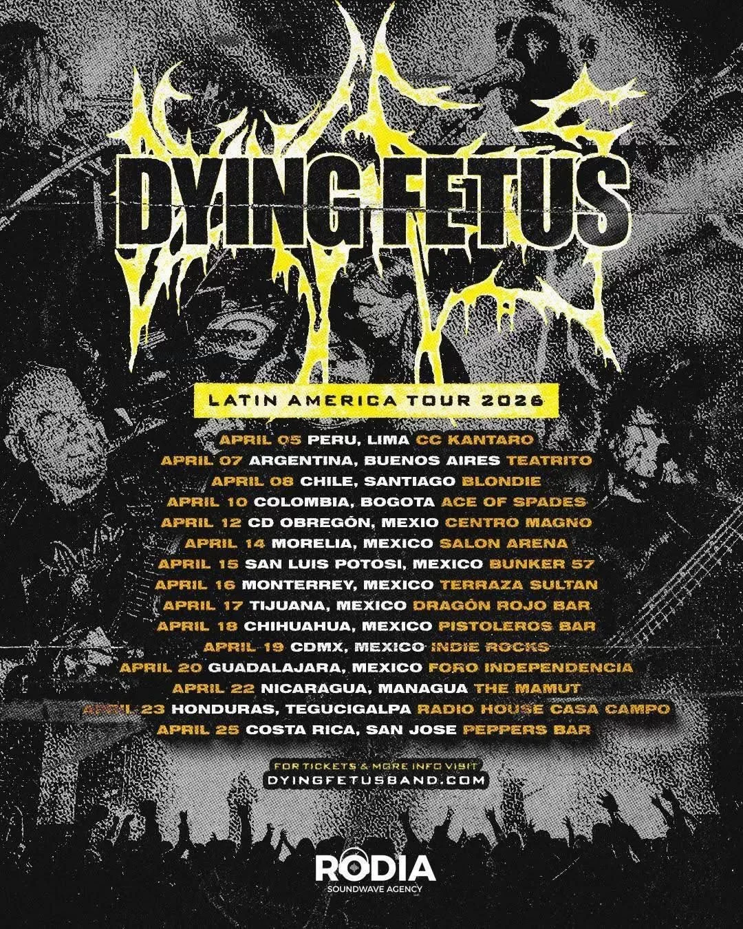 El Latin America Tour 2026 de Dying Fetus, representa una oportunidad única para los fans mexicanos y latinoamericanos de experimentar en vivo la crudeza del death metal de Maryland. La gira inicia el 4 de abril en Lima, Perú, y recorre diferentes países sudamericanos antes de aterrizar en México el 12 de abril en Ciudad Obregón.